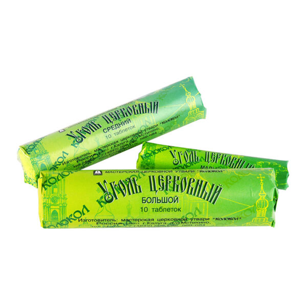 Производственные мастерские «Колокол» предлагают уголь богослужебный диаметром 50 мм, изготовленный из высокосортного угольного порошка, спрессованного в «порционные» таблетки по 10 шт. в брикете. В их изготовлении не использованы вредные добавки, делая применение абсолютно безопасным. Малое время розжига позволяет применять уголь во время отправления треб, а стабильное горение в течении полутора часов идеально соответствует продолжительным церковным службам.